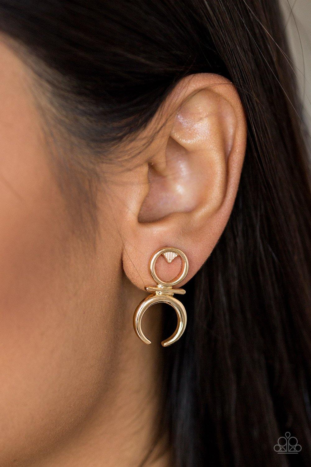 Featuring round and crescent shapes, glistening gold frames connect into an edgy geometrical frame. Earring attaches to a standard post fitting.