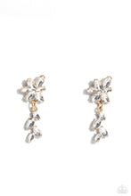 Encased in glistening gold fittings, a glittery collection of marquise cut rhinestones blooms into a brilliant flower. A cascading frame of matching marquise cut rhinestones trickles from the bottom of the sparkling floral frame, adding enchanting movement to the standalone post. Earring attaches to a standard post fitting.