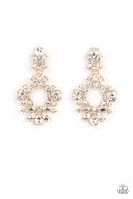 Ablaze with a mismatched assortment of brilliant white rhinestones, a stunning gold wreath swings from the bottom of a dainty white rhinestone fitting for a jaw-dropping dazzle. Earring attaches to a standard post fitting.