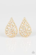 Radiating with glassy white rhinestones, over-sized gold teardrops adorn the ear for a dramatic flair. Earring attaches to a standard post fitting.