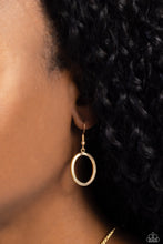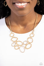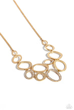 Oblong gold rings in varying sizes intermingle with oblong gold rings dusted with a border of white rhinestones for a sparkly monochromatic statement that cascades down the neckline from a classic gold chain. Features an adjustable clasp closure.