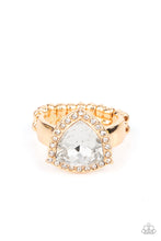 An oversized trilliant cut white rhinestone encased in a sparkling rhinestone-encrusted gold frame steals the spotlight and creates an eye-catching stunner atop the finger. Features a dainty stretchy band for a flexible fit.