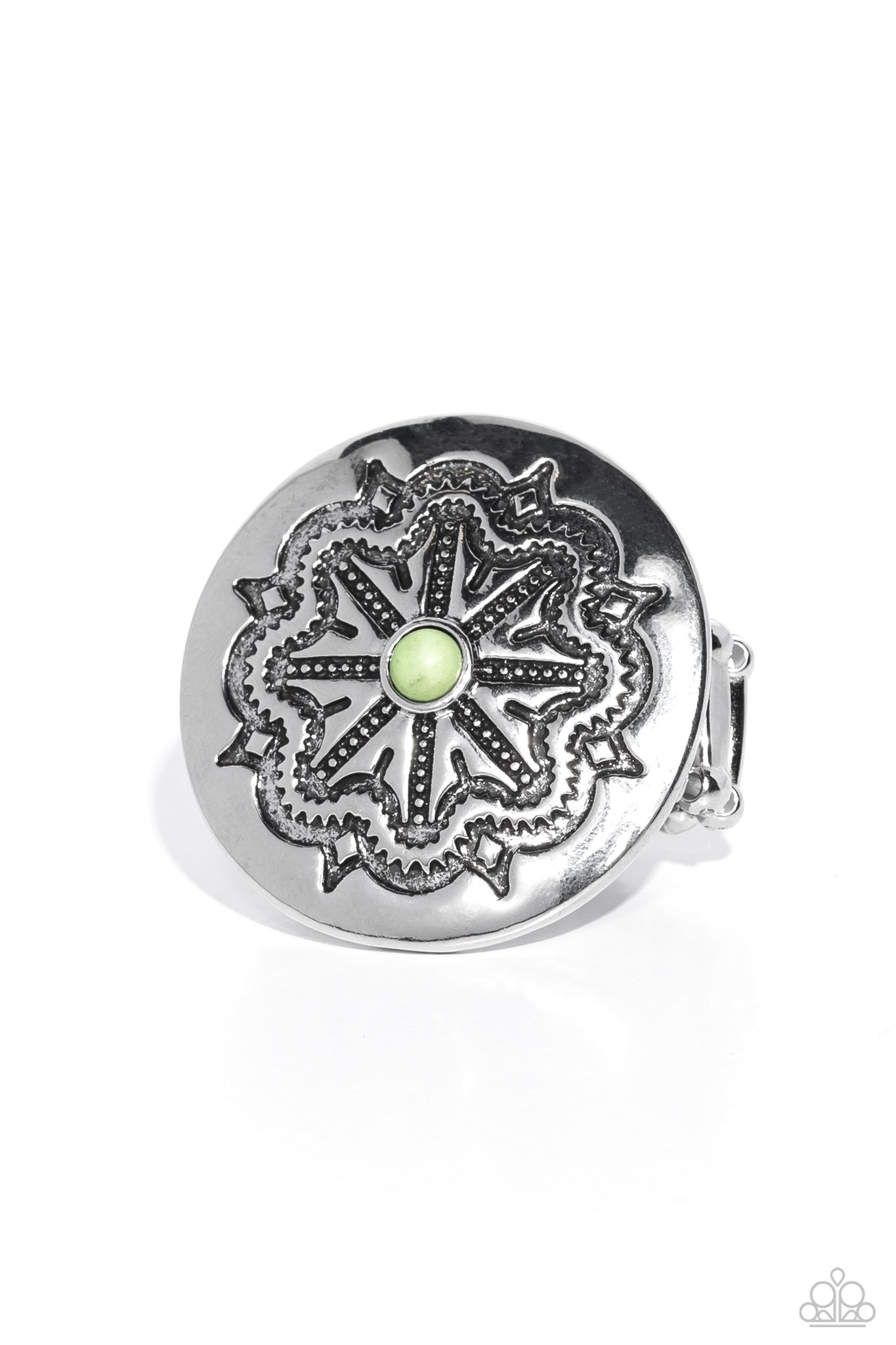 Stamped in botanical filigree, a flat, glistening, silver disc displays an earthy apple green stone center around its dancing texture for a seasonal look. Features a stretchy band for a flexible fit. As the stone elements in this piece are natural, some color variation is normal.