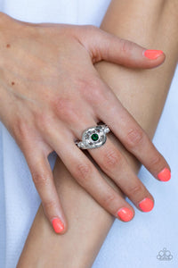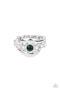 Swooping bands of silver nestle around a glassy band of dainty white rhinestones. A solitaire green rhinestone adorns the center of the glittery compilation, creating a timeless centerpiece atop the finger. Features a dainty stretchy band for a flexible fit.