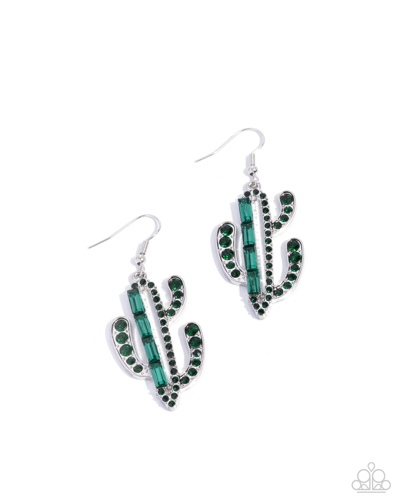 An airy silver cactus is embellished with varying sizes of emerald rhinestones and a quartet of emerald emerald-cut gems for a dazzling desert-inspired lure. Earring attaches to a standard fishhook fitting.