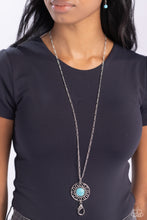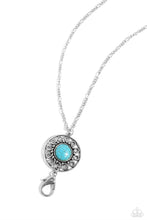 An oversized turquoise stone adorns the center of an antiqued silver frame radiating with silver studded and wire-like detail, creating an authentic artisan inspired pendant. A lobster clasp hangs from the bottom of the design to allow a name badge or other item to be attached. Features an adjustable clasp closure.