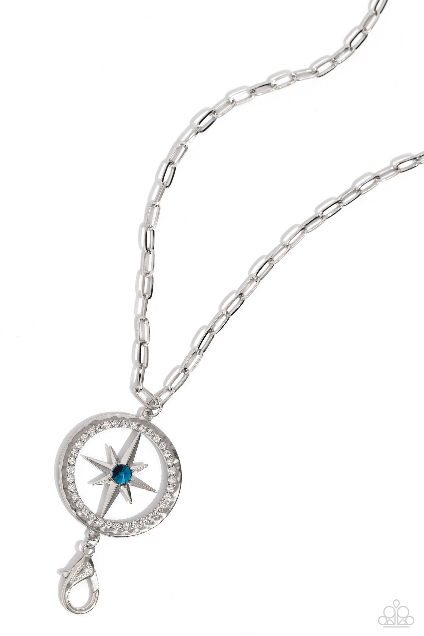 A three-dimensional silver star, dotted with a solitaire blue rhinestone, is affixed to the center of a hammered silver out-of-this-world hoop that dangles from a silver paperclip chain. White gems border the star on the hammered silver hoop for additional glitz. A lobster clasp hangs from the bottom of the design to allow a name badge or other item to be attached. Features an adjustable clasp closure.