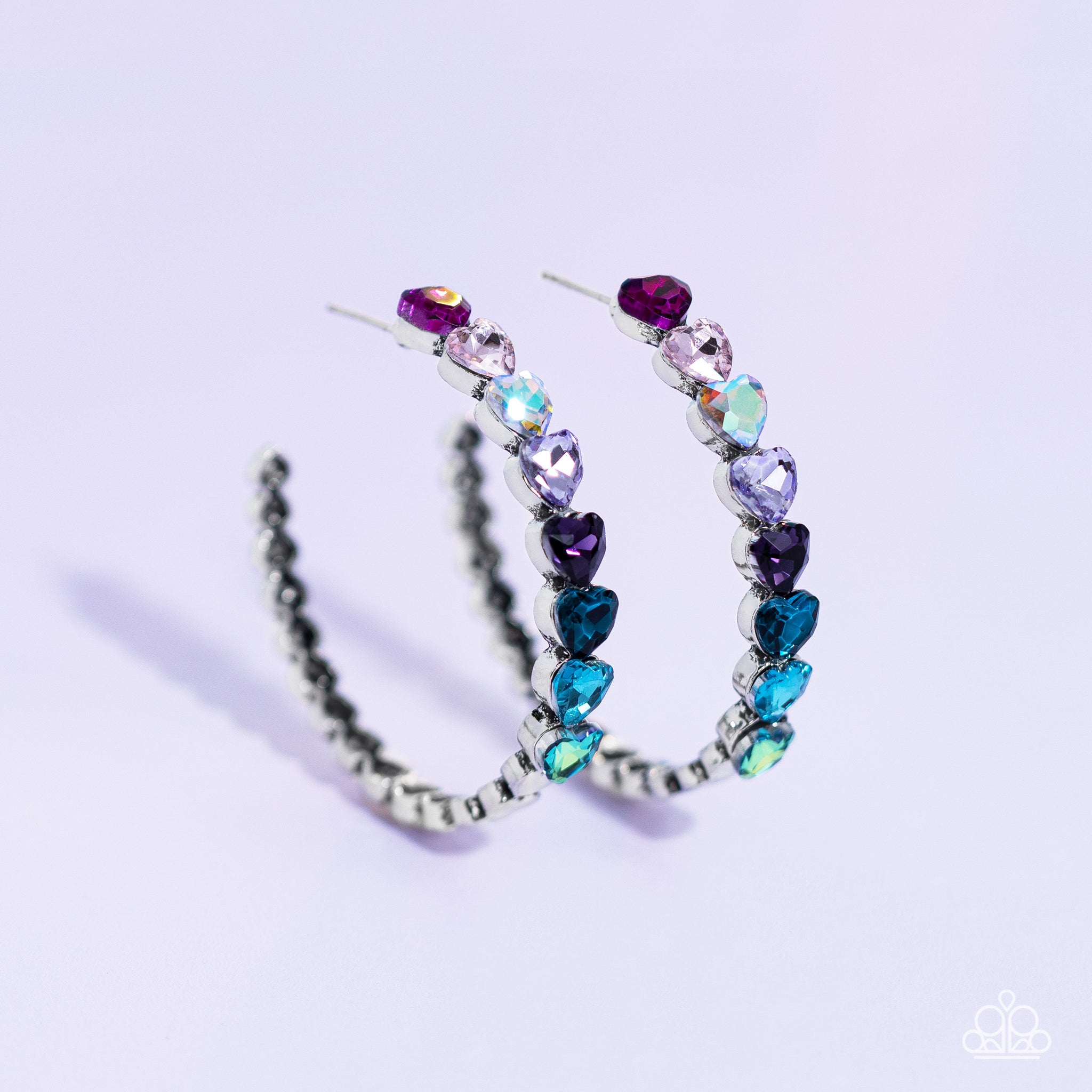 Featuring a scalloped heart frame, glittery heart rhinestones in shades of magenta, light pink, iridescence, light purple, dark purple, dark blue, light blue, and a refracted shimmer slowly decrease in size as they curve down the ear to meet dainty silver hearts for a romantic statement. Earring attaches to a standard post fitting. Hoop measures approximately 1 3/4" in diameter. Due to its prismatic palette, color may vary.
