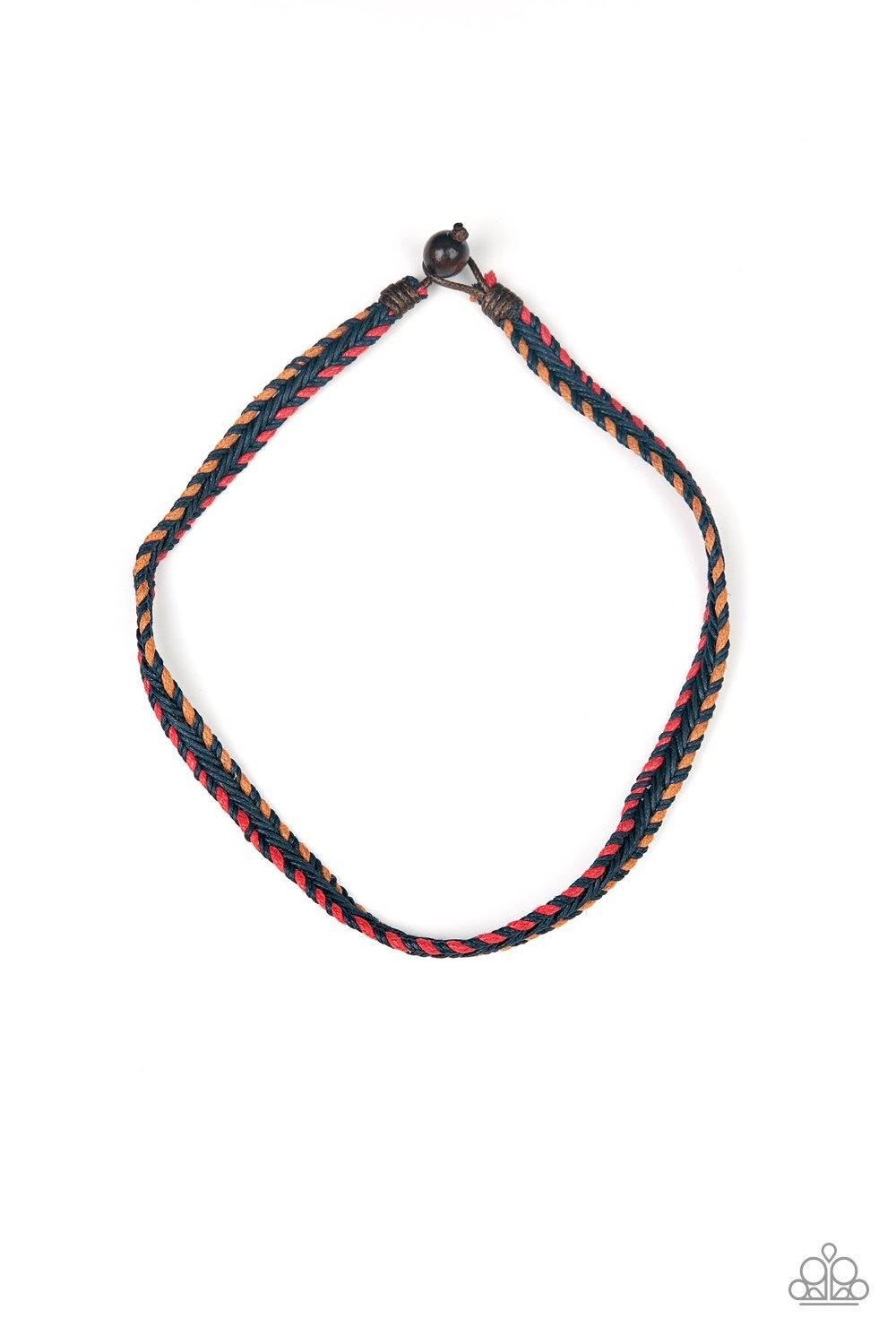 Shiny blue cording knots around brown and red cording, creating a colorful braid below the collar. Features a button loop closure.