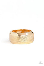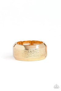 The center of a beveled gold band has been delicately hammered in shimmery detail for a metro inspired look. Features a stretchy band for a flexible fit.