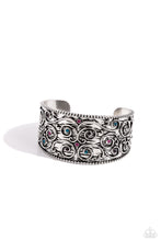 Bordered in dainty silver studs, a swirly motif whirls across the textured front of a thick silver cuff. Dainty silver studs and glittery purple, pink, and blue rhinestones are sprinkled across the design, adding a spritz of glitz to the tactile centerpiece.