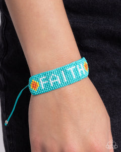 Resembling a handwoven pattern, white seed beads spell out the word "Faith" atop a tiffany, yellow, and orange seed bead-embellished bracelet for an iconic, inspirational look. Features an adjustable sliding knot closure.