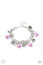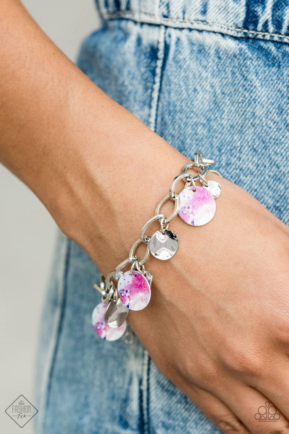 Featuring a galactic tie dye print, a collection of colorful and dainty silver discs swings from a bulky silver chain around the wrist for a trendy finish. Features an adjustable clasp closure.