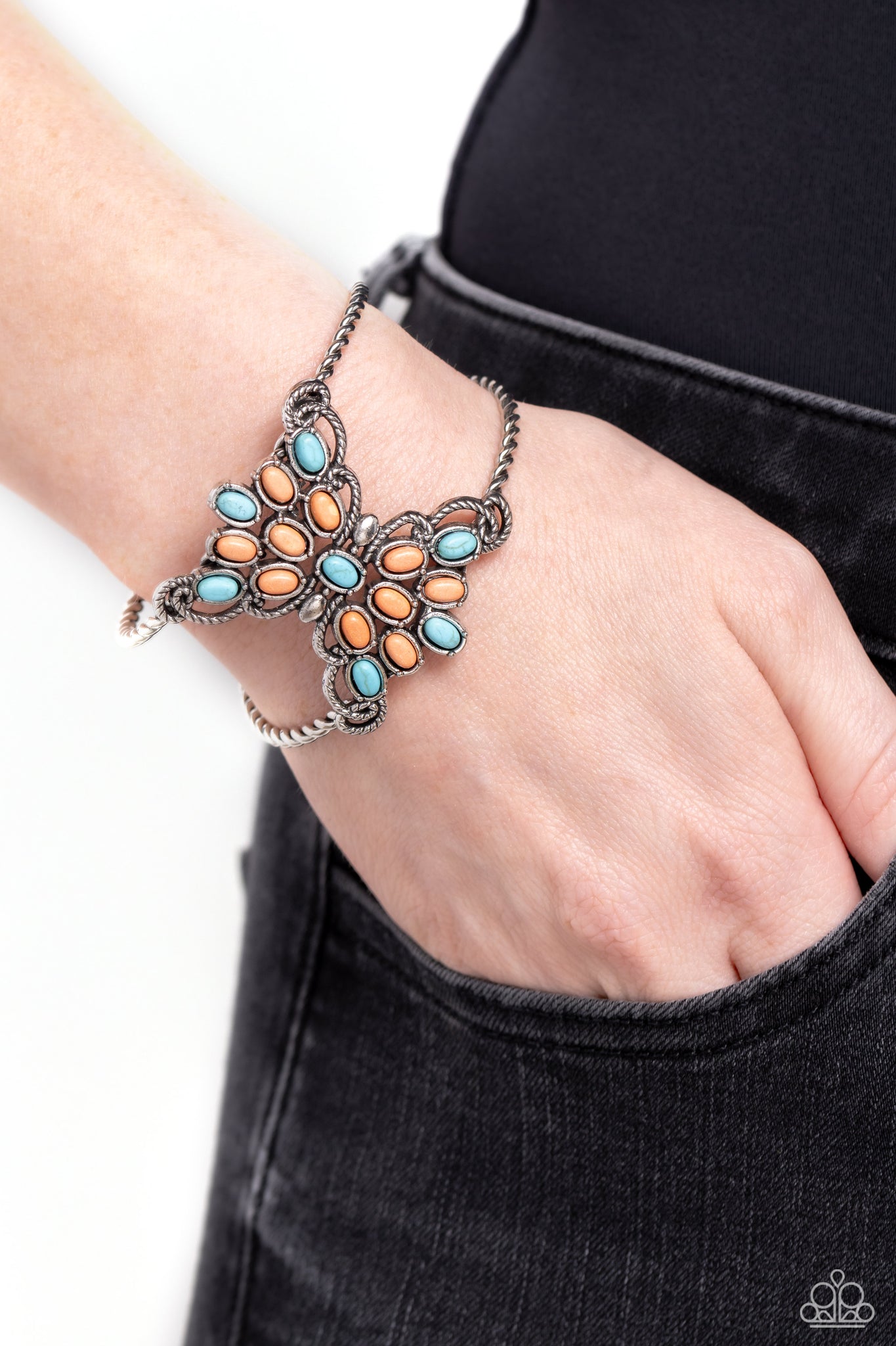 Infused with studded silver fittings, a refreshing collection of turquoise and orange oval stones coalesce inside scalloped rows of silver ropelike filigree. The earthy stone centerpiece sits atop an airy silver cuff featuring twisted silver detail.