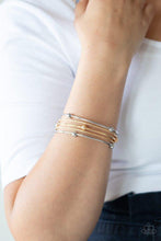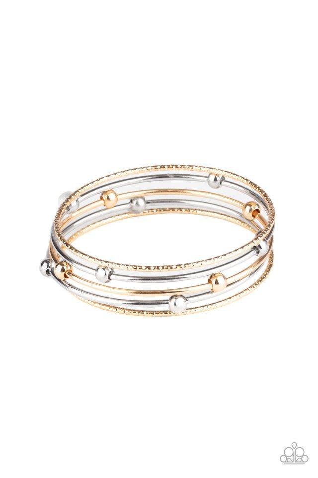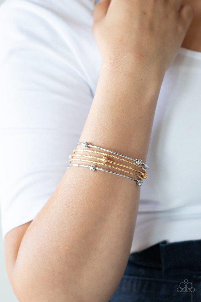 A pair of delicately hammered gold bangles joins a trio of silver and gold beaded bangles around the wrist, creating a collision of metallic texture.