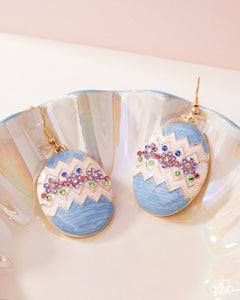 Featuring light blue, white, and light pink pearl paint, a gold easter egg glistens below the ear for a springtime-inspired pop of color. Multicolored dainty rhinestones pattern across the middle of the egg in floral patterns for additional whimsical detail. Earring attaches to a standard fishhook fitting.