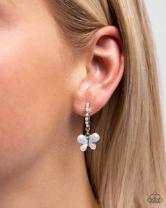 Pressed in a scalloped silver fitting, white pearls curl around the ear for a refined fashion giving way to a silver butterfly with blue and baby pink sparkly resin wings for a whimsically sophisticated look. Earring attaches to a standard post fitting. Hoop measures approximately 5/8" in diameter.