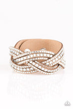 Varying in size, glassy white rhinestones are encrusted along interwoven brown suede bands, creating blinding shimmer across the wrist. Features an adjustable snap closure.