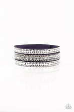 Rows of flat silver discs, glassy white rhinestones, and shimmery silver chains are encrusted along blue suede bands for a sassy look. Features an adjustable snap closure.