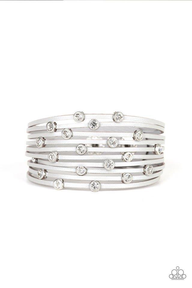 A shiny gray leather band has been spliced into skinny strands. Glittery white rhinestones are haphazardly sprinkled across the bands, scattering shimmer across the wrist. Features an adjustable snap closure.