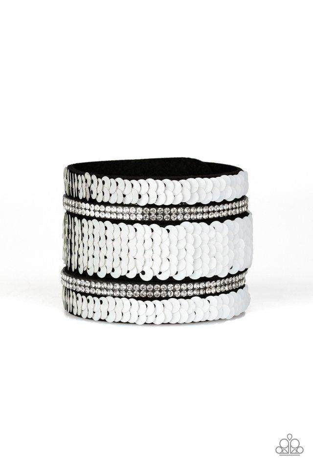 Infused with strands of blinding white rhinestones, row after row of shimmery sequins are stitched across the front of a spliced black suede band. Bracelet features reversible sequins that change from white to multicolored. Features an adjustable snap closure.