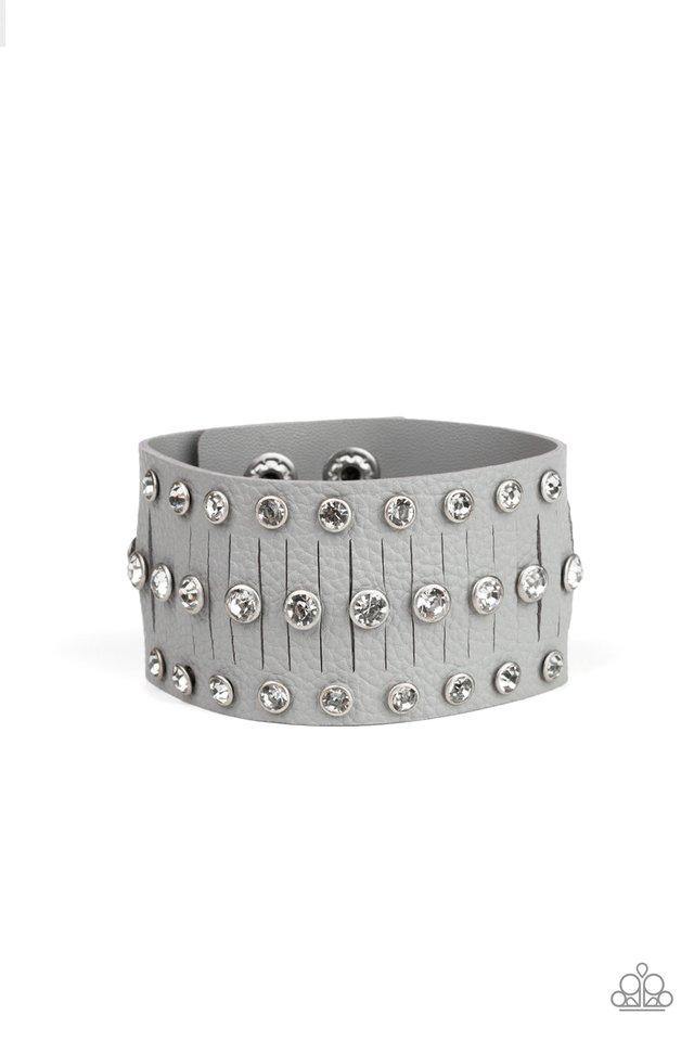 Pressed into sleek silver frames, glittery white rhinestones are studded across a thick gray leather band featuring a center lined with slits for a sassy finish. Features an adjustable snap closure. Sold as one individual bracelet.
