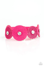 Dotted with white rhinestone centers, round pink suede frames join across the wrist for a whimsical look. Features an adjustable snap closure.
