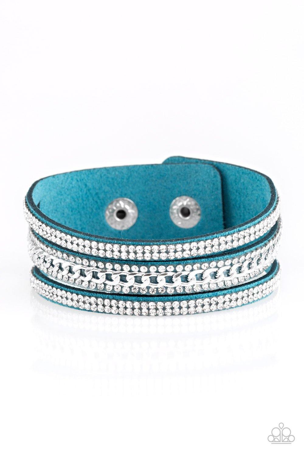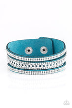 Rows of glassy white rhinestones and a shimmery silver chain are encrusted along blue suede bands for a sassy look. Features an adjustable snap closure.