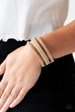 Rows of glassy peach and white rhinestones and a shimmery gold chain are encrusted along tan suede bands for a sassy look. Features an adjustable snap closure.