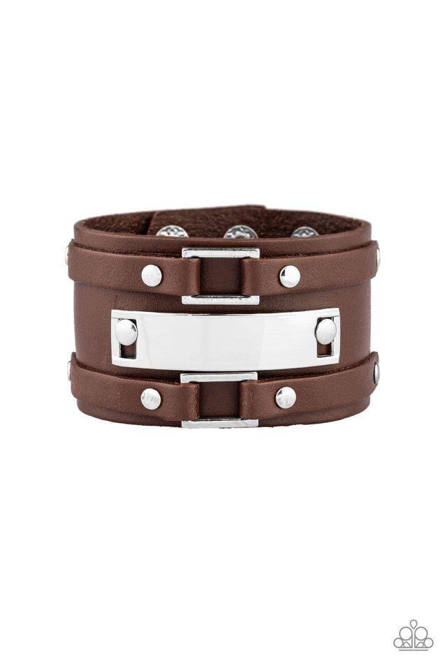 A collection of leather pieces and shiny silver frames are studded in place across the front of a thick leather band, creating an abstract buckle. Features an adjustable snap closure.