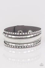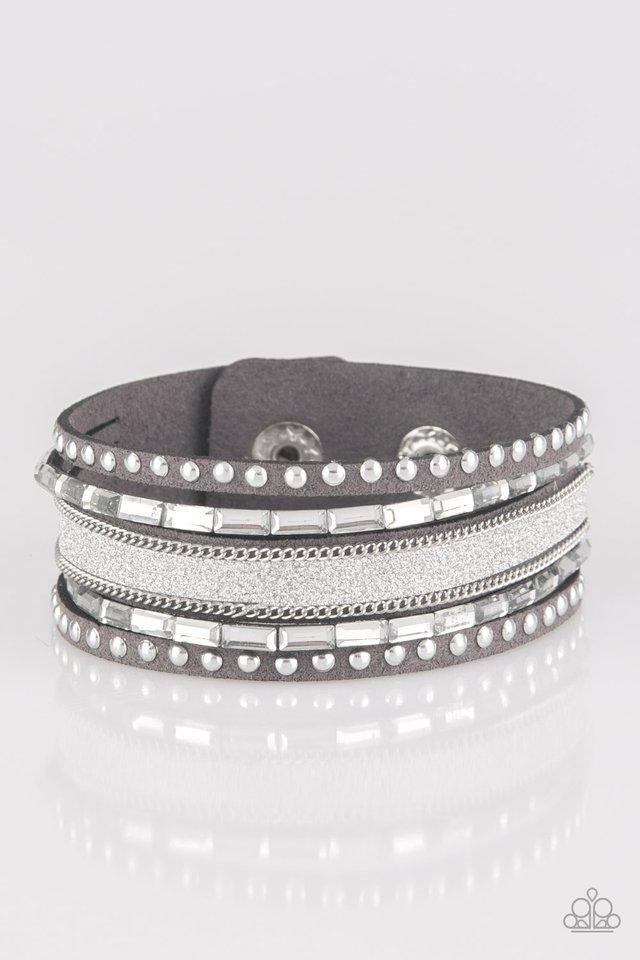 Shimmery silver studs, dainty silver chains, and white emerald style cut rhinestones are encrusted along a gray suede band dusted in a sparkling center for a sassy look. Features an adjustable snap closure.