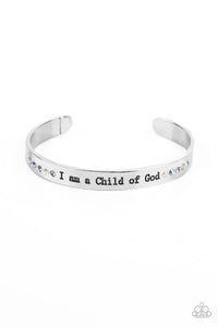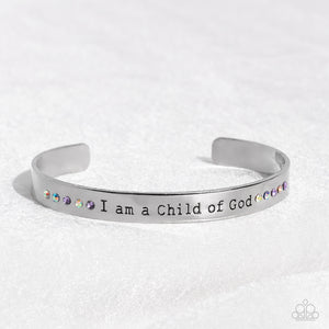 A shiny silver cuff stamped with the phrase I am a Child of God" encircles the wrist. Dainty sapphire, violet and iridescent rhinestones shimmer at the borders of the phrase for a whimsical finish. Due to its prismatic palette, color may vary.