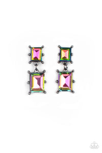Two brilliant baguette cut oil spill rhinestones, set in classic gunmetal pronged settings, stack one over the other creating a cosmically radiant statement. Earring attaches to a standard post fitting.
