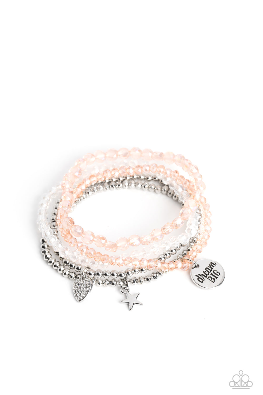 Reflective orange, defaced silver, reflective white, and smooth silver beads wrap around stretchy bands, and combine into a colorful stack along the wrist. The reflective, orange-beaded bracelet features a silver pendant with the phrase "dream BIG" stamped on it, while a defaced, silver-beaded bracelet features a silver star charm. Hanging from smooth, silver beads, a heart charm embossed with white rhinestones adds a shimmery detail to the stack, resulting in a youthful, dreamy design.