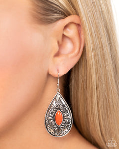 A marquise shaped Burnt Orange bead is pressed into the center of a rustic silver frame stamped and embossed in floral details, creating a seasonal pop of color. Earring attaches to a standard fishhook fitting.