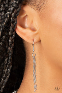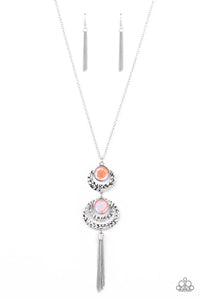 Hammered silver bars arc out from under a pair of prismatic orange gems at the bottom of a lengthened silver chain. A shimmery silver chain tassel swings from the bottom of the enchanted frames, adding playful movement to the ethereal centerpiece. Features an adjustable clasp closure. Due to its prismatic palette, color may vary.