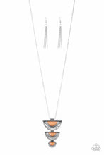 Featuring orange stone centers, decorative half-moon silver frames stack at the bottom of a lengthened silver chain for a whimsical look. Features an adjustable clasp closure.