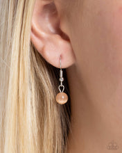 Pressed in a thin, silver teardrop frame, an orange cat's eye teardrop is suspended inside a larger, silver teardrop frame, swinging along a shimmery silver snake chain, creating a whimsical pendant. Features an adjustable clasp closure.