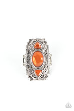 A mystical trio of oval and triangular cut burnt orange beads stack across the front of a dramatically oversized silver frame abloom with studded and vine-like motifs, resulting in an enchanting centerpiece atop the finger. Features a stretchy band for a flexible fit.