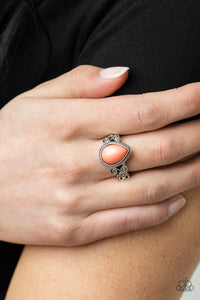 A dewy Burnt Coral teardrop bead is pressed into a delicately braided silver frame. Featuring silver filigree scrolls, an airy band creates a dreamy backdrop for the centerpiece as it sits atop the finger. Features a dainty stretchy band for a flexible fit.