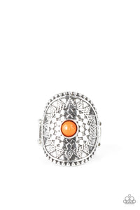 An antiqued silver sunburst pattern blooms from a vivacious orange beaded center, creating a radiant frame atop the finger. Features a stretchy band for a flexible fit.