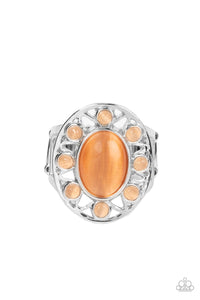 Dainty orange cat's eye stone beads radiate out from an oval orange cat's eye stone center, resulting in a radiant sunburst pattern atop the finger. Features a stretchy band for a flexible fit.
