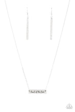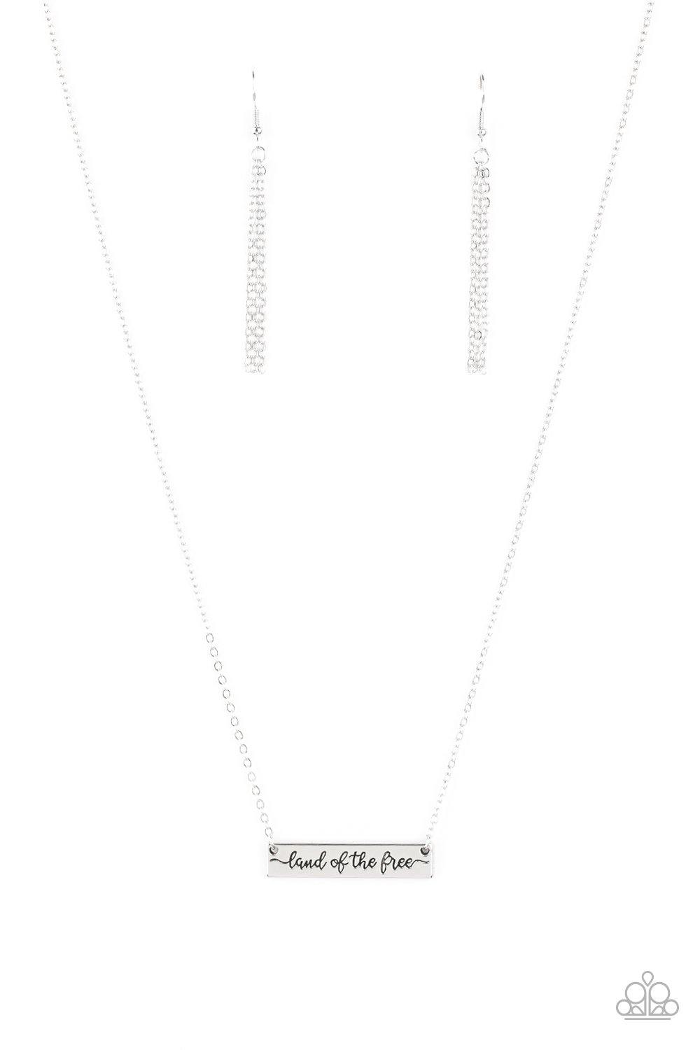 Stamped in the phrase, "Land of the Free," a silver rectangular frame is suspended by a dainty silver chain below the collar for a patriotic inspired look. Features an adjustable clasp closure.