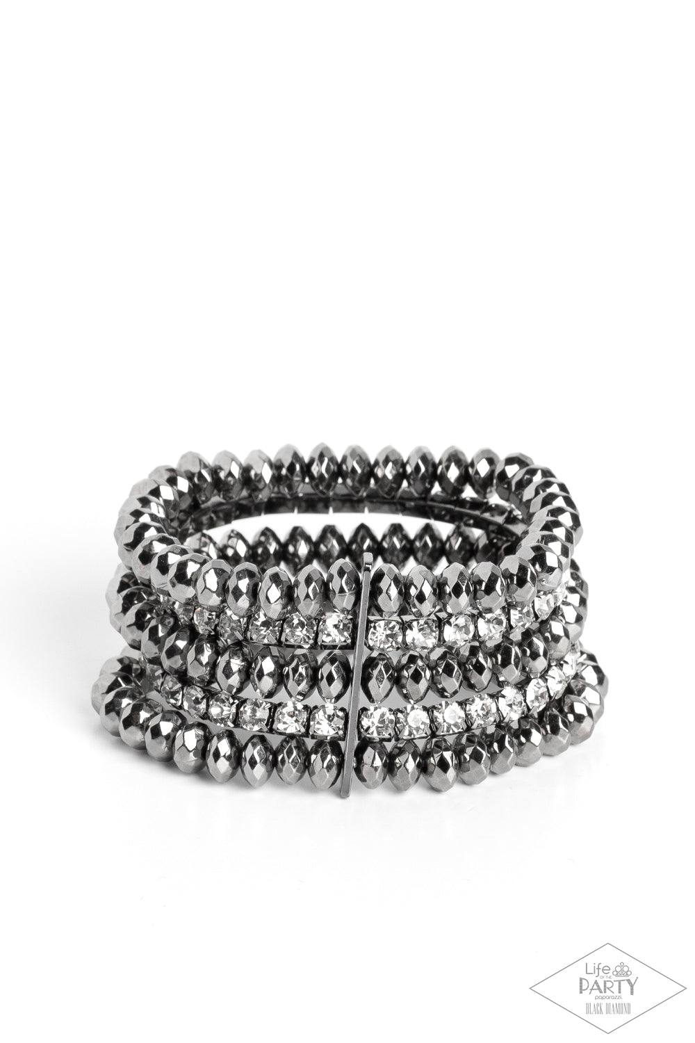 Held together with a sleek gunmetal fittings, edgy rows of faceted gunmetal beads and glittery white rhinestones are threaded along stretchy bands around the wrist, creating glamorous layers.