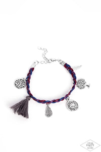 Shiny blue, red, and purple cording weaves into a colorful braid across the wrist. Radiant silver charms and a soft threaded tassel swing from the wrist in a free-spirited, wanderlust fashion. Features an adjustable clasp closure.
