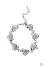 Dotted with dainty light pink rhinestones, airy silver heart silhouettes are affixed to the points of larger silver heart frames. The two-dimensional heart frames link together around the wrist in a flirtatious finish. Features an adjustable clasp closure.