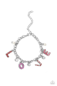 Dangling along a silver link chain, silver letters with various Valentine's-inspired details spell out the word "LOVE" as they alternate alongside solitaire white rhinestones and white pearls in a flattering finish around the wrist. The "L" features a red background with white rhinestones and white pearls, the "O" features hot pink-painted hearts, the "V" features stripes of red and baby pink, and the "E" features a baby pink glitter backdrop. Features an adjustable clasp closure.