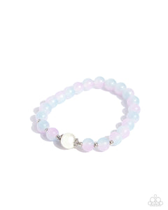 Pink to blue ombré beads, dainty silver beads, and an iridescent-dipped pearl are infused along an elastic stretchy band along the wrist for a mermaid-inspired masterpiece.