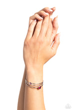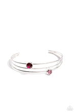 A pair of Pale Rosette and Fuchsia Fedora rhinestones sporadically adorn a layered silver cuff, creating a dainty dazzle around the wrist.