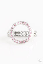 Encrusted in glittery pink rhinestones, a circular frame adorns the finger, creating a glamorous centerpiece. Features a stretchy band for a flexible fit.